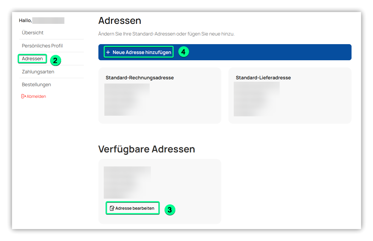 Nachdem Sie sich im Onlineshop eingeloggt haben, können Sie im Kundenbereich bestehende Adressen anpassen, sowie neue, zusätzliche Adressen erstellen.