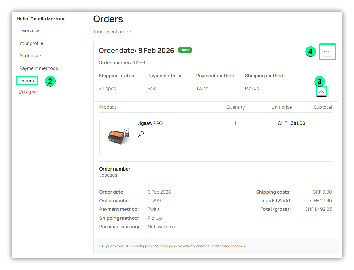 2. In your customer account, click on ‘Orders’ on the left-hand side.