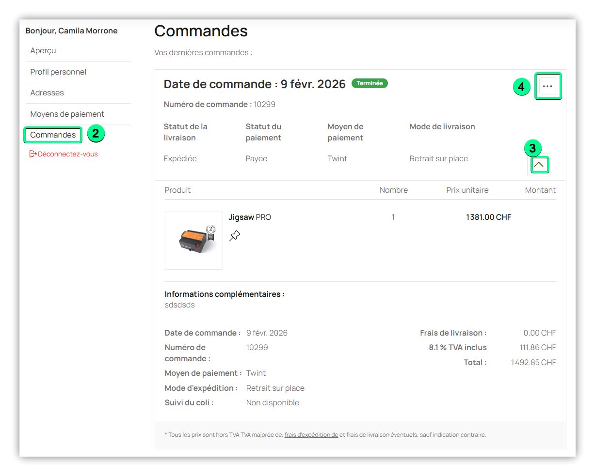 Vous trouverez vos commandes comme suit :