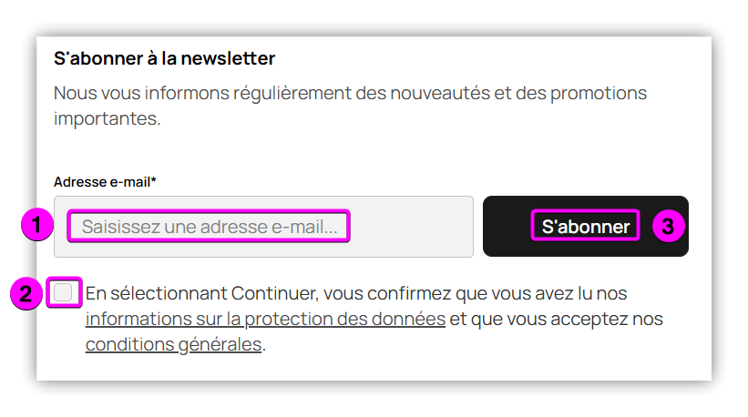 Le formulaire d'inscription à la newsletter se trouve tout en bas de la page, dans le pied de page.
